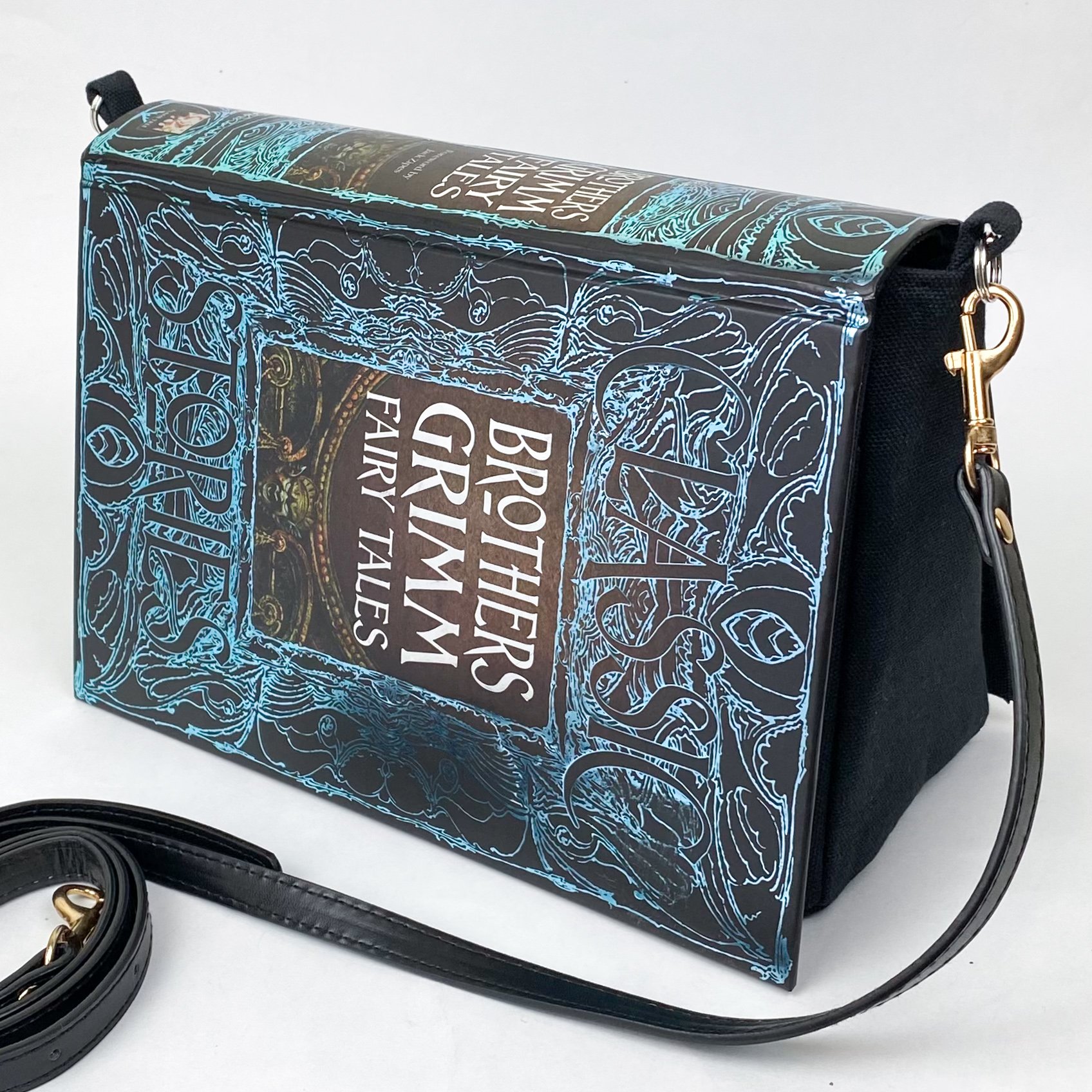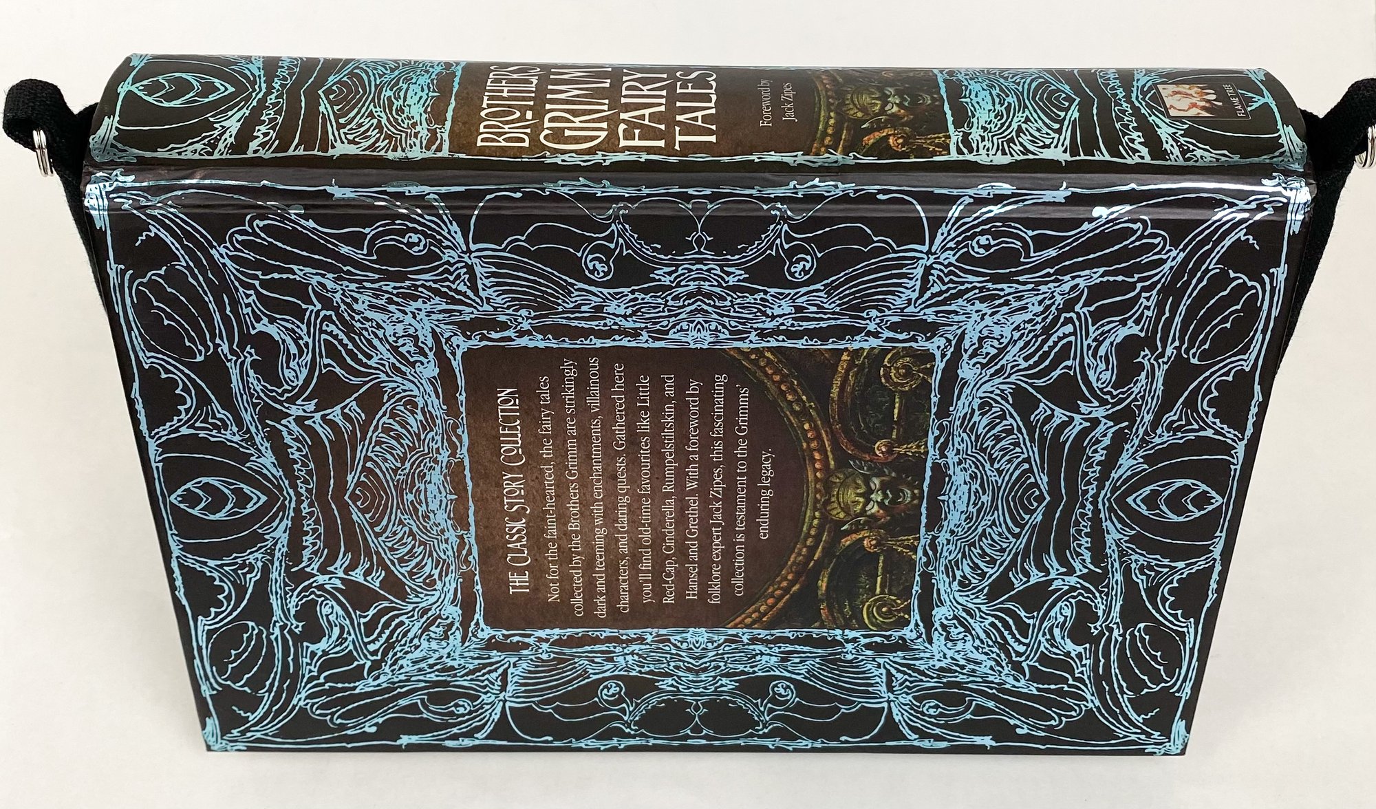 Details: Dark grey, almost black book cover with metallic blue details. The inside bag has been sewn with sturdy black canvas fabric. The design includes a large front pocket, a 120cm black vegan leather adjustable strap and a magnetic clasp closure. The strap is removable, so you can use it as a clutch as well!