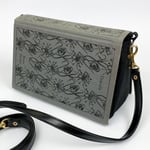 Details: dark grey cloth bound book cover with black embossed details. The inside bag has been sewn with sturdy black canvas fabric. The design includes a large front pocket, a 120cm black vegan leather strap (cross body length) and magnetic closure. The strap is removable, so you can use it as a clutch as well!