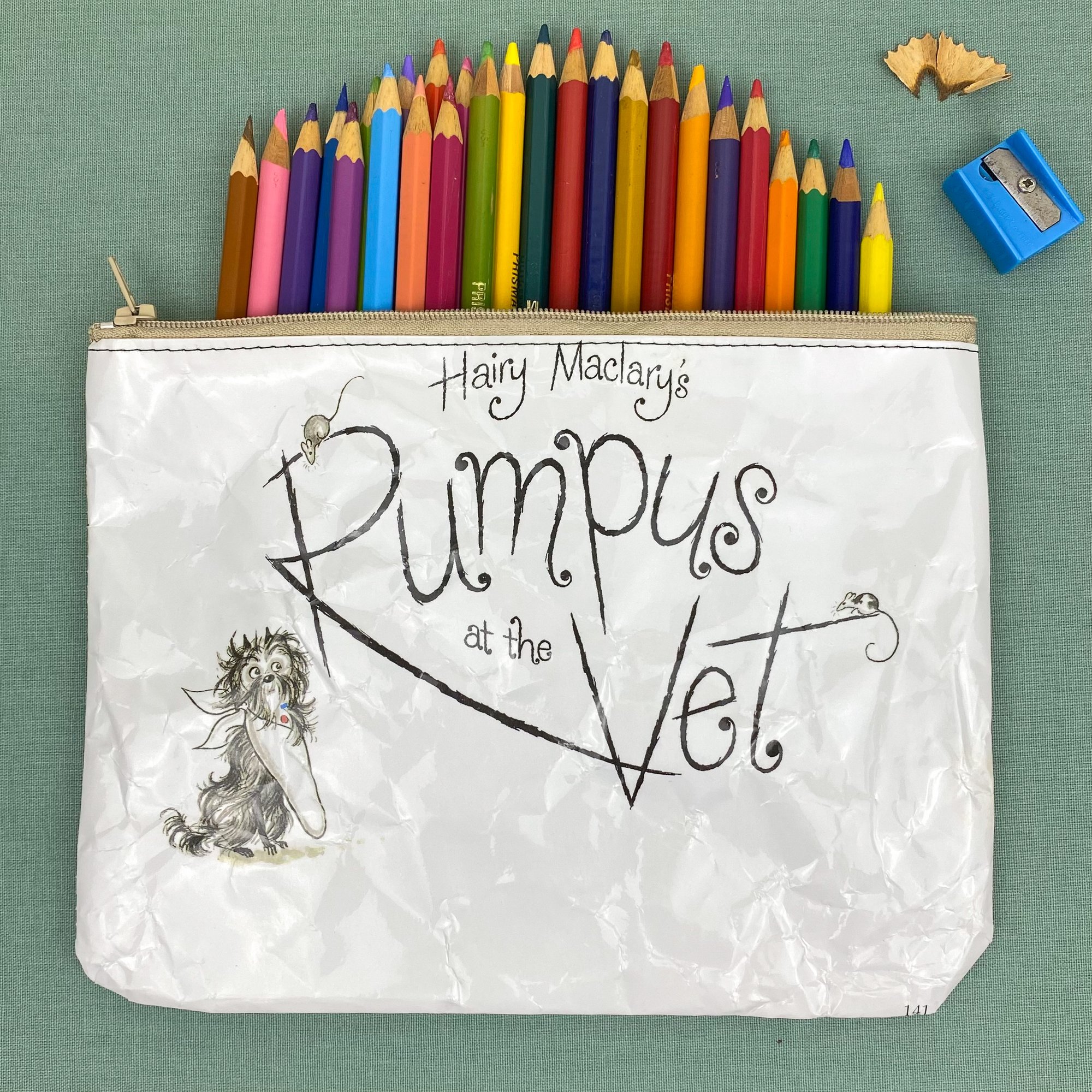 Both sides of the pages are covered in clear plastic for protection and durability. They can withstand the odd splash of water and can be wiped clean with a damp cloth, but they are not fully waterproof (where there’s stitching). You may notice the pages have a few crinkles, these occur during the making process when the finished pencil case is turned right side out, but I feel the crinkles add character! The pencil case is unlined so you can read the pages on the inside as well!