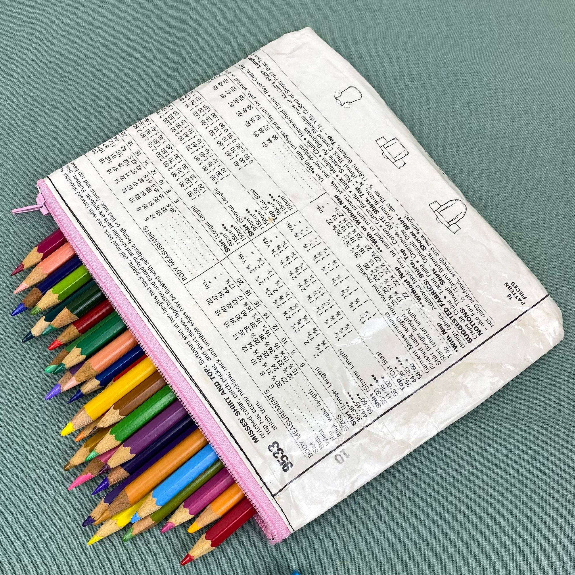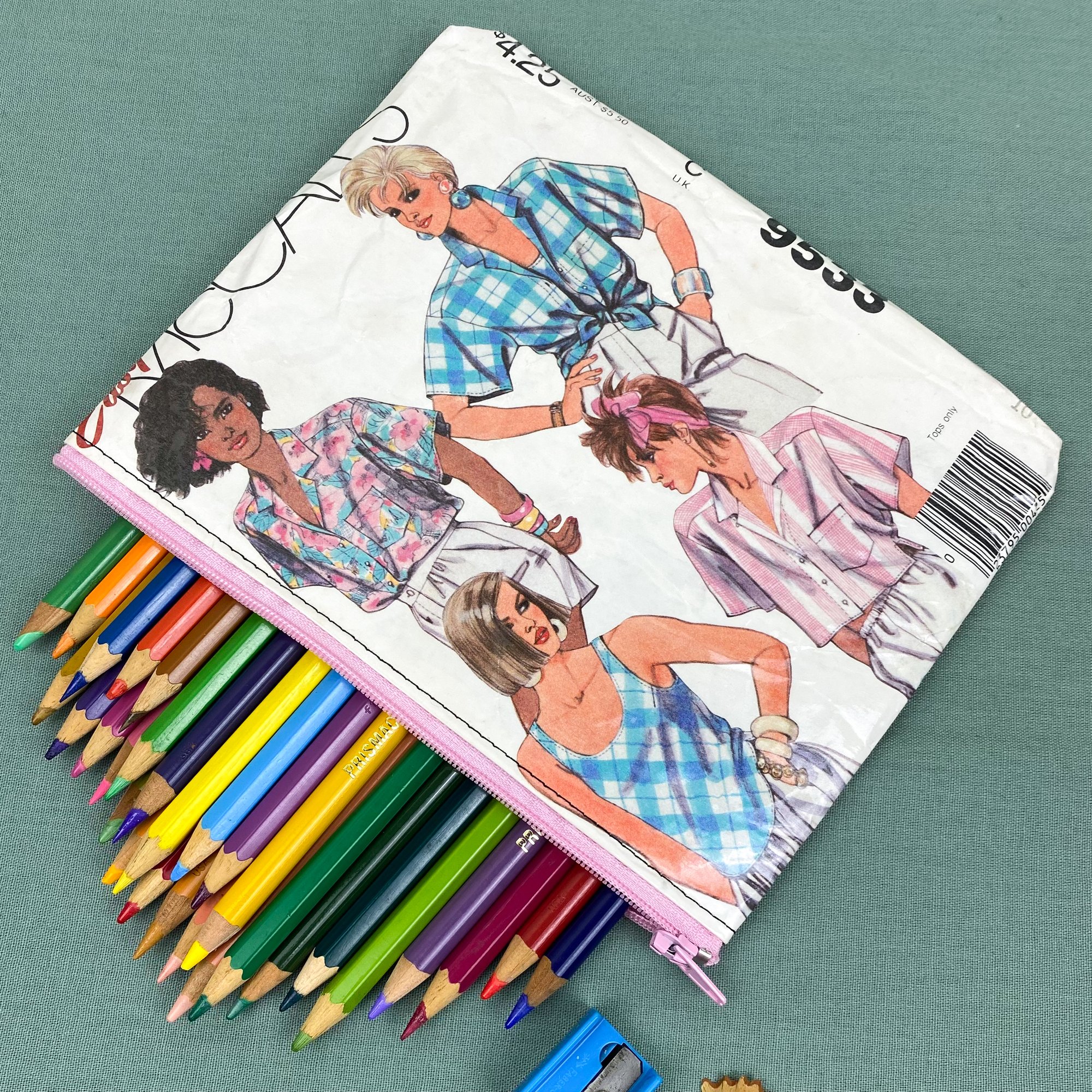 These are a versatile zipper pouch made from repurposed sewing patterns. Use them as a pencil case, wallet, cosmetic bag, or for storing all the little bits and bobs that get lost in your bag.