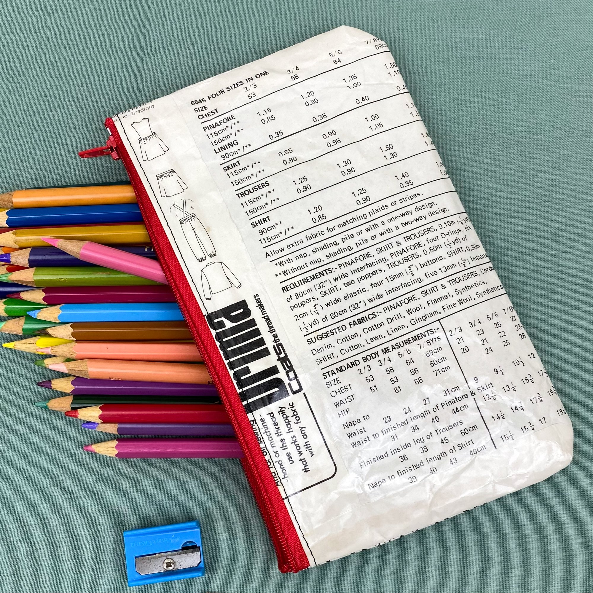 These are a versatile zipper pouch made from repurposed sewing patterns. Use them as a pencil case, wallet, cosmetic bag, or for storing all the little bits and bobs that get lost in your bag.