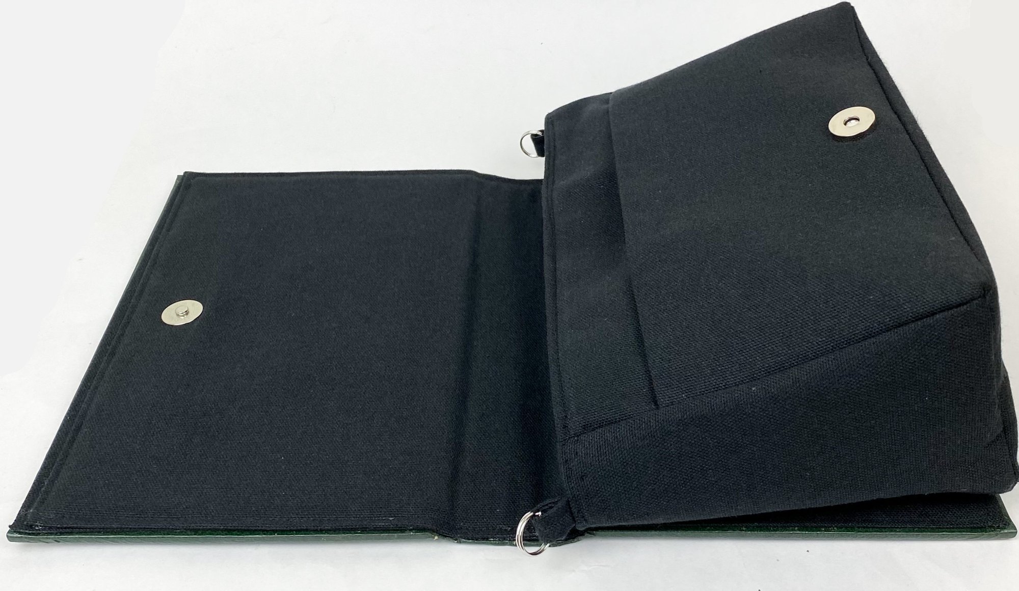 Details: blue leatherbound book cover with white, purple and metallic gold details. The inside bag has been sewn with sturdy black canvas fabric. The design includes a large front pocket, a 120cm black vegan leather adjustable strap and a magnetic clasp closure. The strap is removable, so you can use it as a clutch as well!