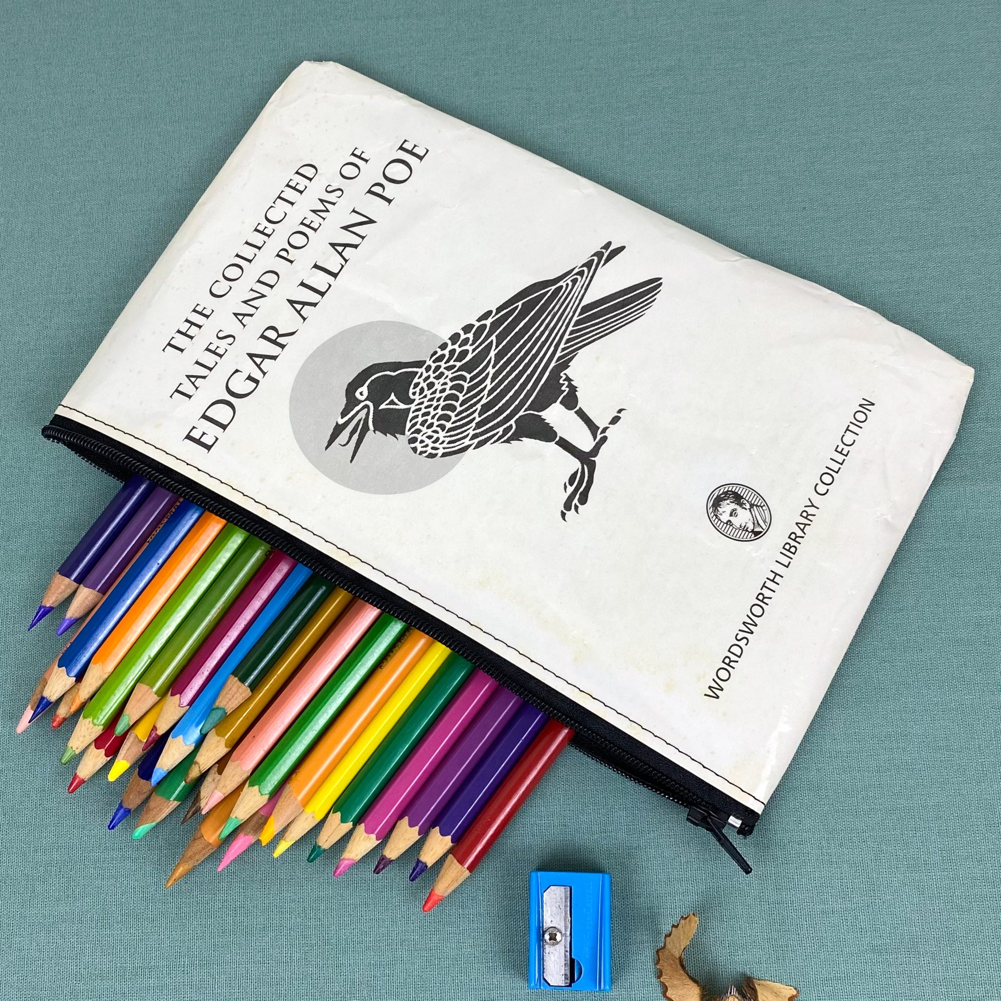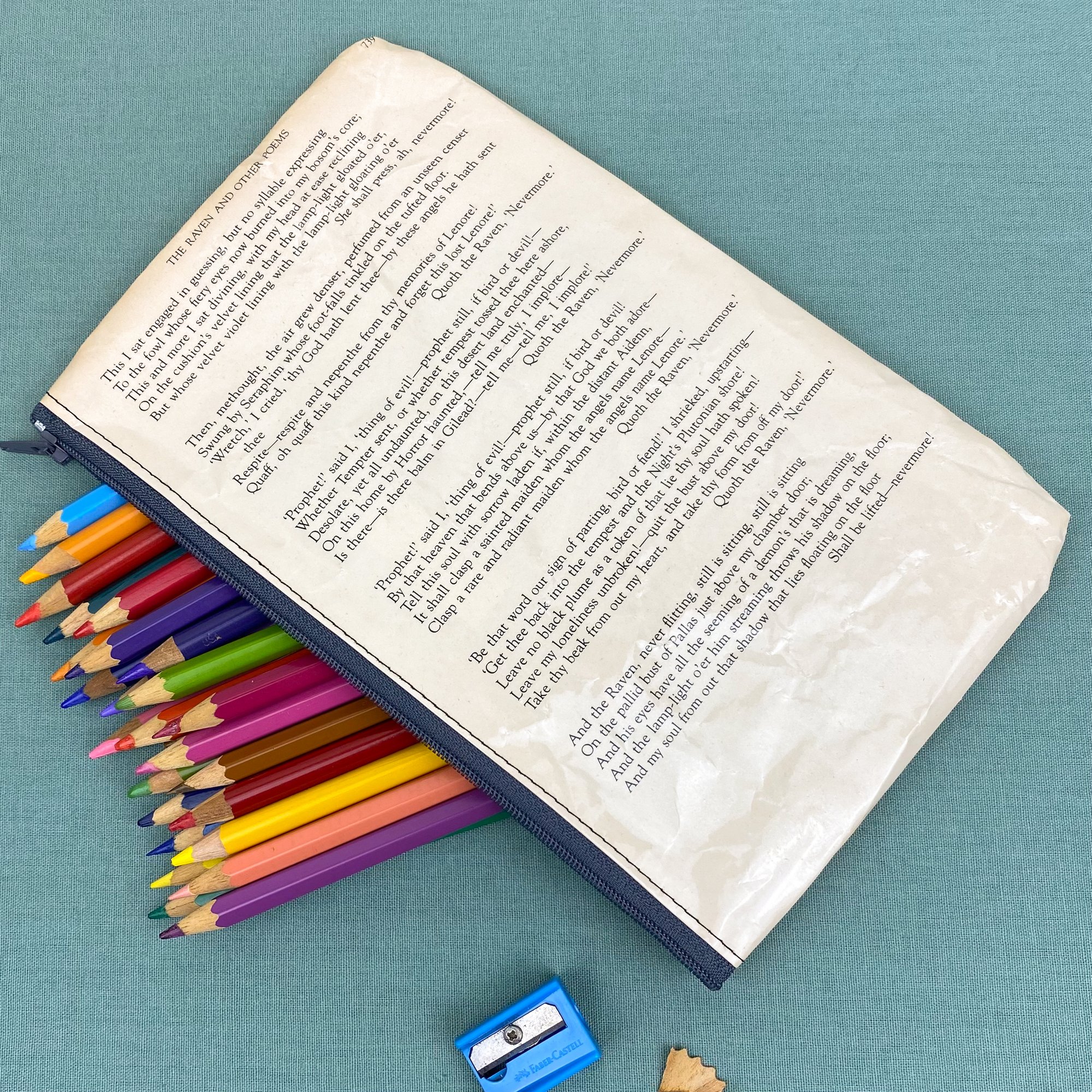 Both sides of the pages are covered in clear plastic for protection and durability. They can withstand the odd splash of water and can be wiped clean with a damp cloth, but they are not fully waterproof (where there’s stitching). You may notice the pages have a few crinkles, these occur during the making process when the finished pencil case is turned right side out, but I feel the crinkles add character! The pencil case is unlined so you can read the pages on the inside as well!